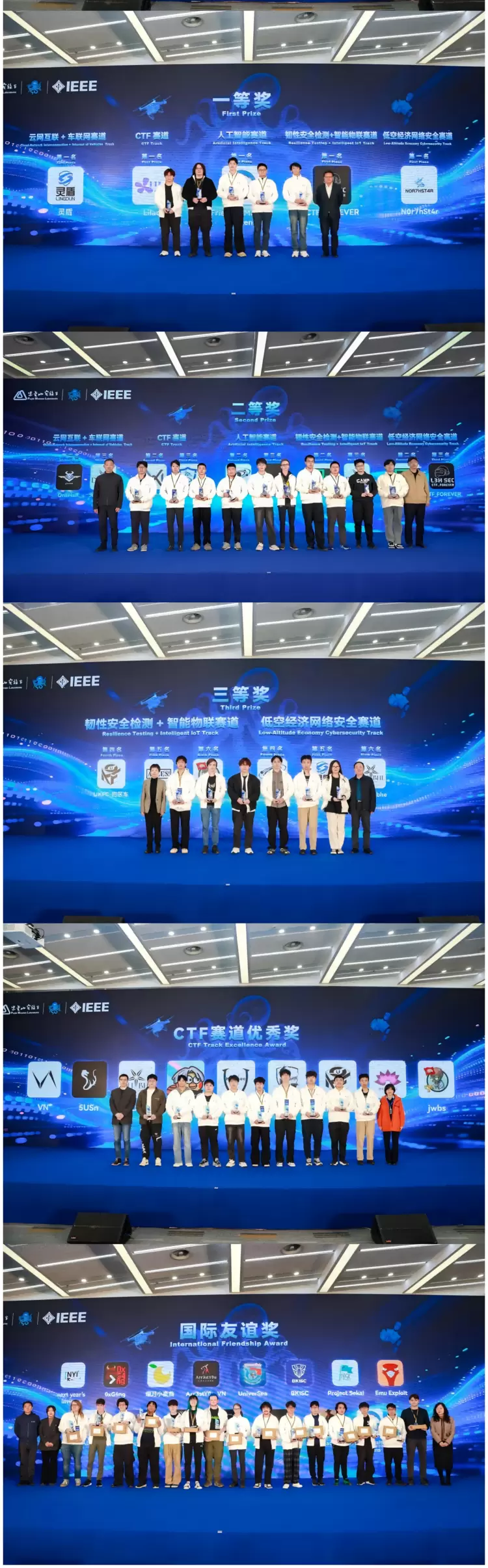 最终,来自联合高校的W&M战队夺得本届赛会总冠军。大赛一等奖7支战队,Lilac战队在CTF赛道获得第1名、灵盾战队在云网互联赛道获得第1名、Polaris战队在车联网赛道获得第1名、FMC战队在人工智能赛道获得第1名、N0r7hSt4r战队在低空经济网络安全赛道获得第1名、CTF_FOREVER战队在韧性安全检测赛道获得第1名、天枢Dubhe战队在智能物联赛道获得第1名。此外,大赛还决出了二等奖10支战队、三等奖15支战队、CTF赛道优秀奖/参与奖、国际友谊奖等荣誉。