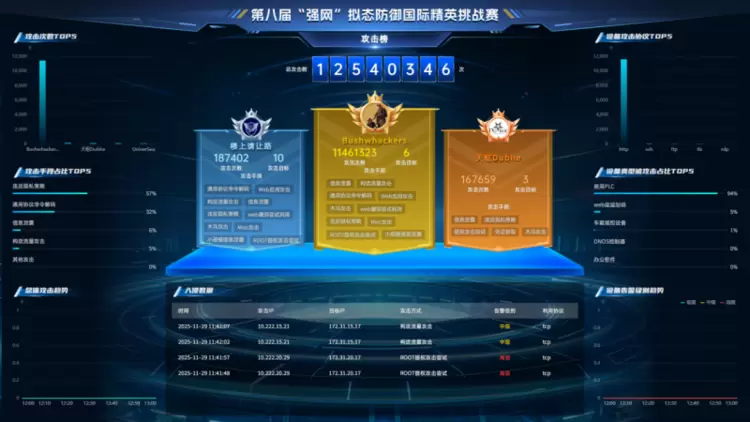 作为第五届网络空间内生安全学术大会亮点之一,第八届“强网”拟态防御国际精英挑战赛堪称网络安全界的“世界杯”。本届赛事吸引了全球40支国际战队和上千支国内战队参赛,规模创历史新高!来自美国、德国、俄罗斯等多个国家的顶尖团队,和国内战队同台竞技,上演“网络攻防大战”。经过72小时激烈角逐,第八届“强网”拟态防御国际精英挑战赛于11月29日12点整在南京紫金山实验室正式落下帷幕,终局之战已见分晓。