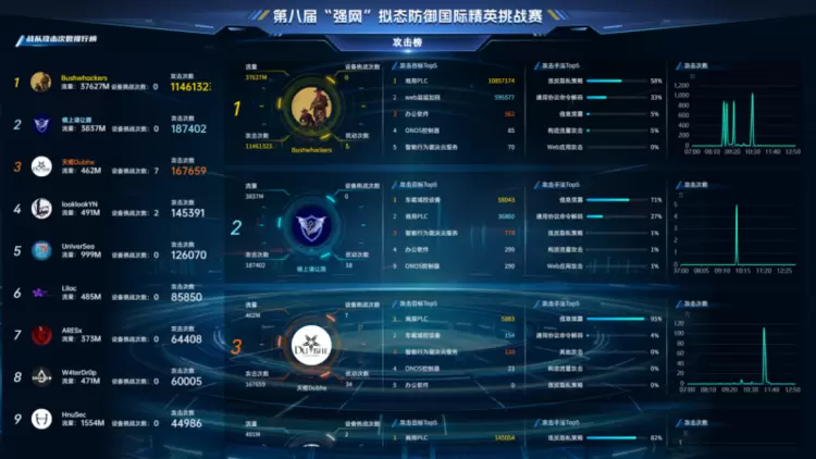 本次大赛共计58个靶标,最终仅4款内生安全相关的靶标未被攻破,总攻击次数1254万次,其中1150万次攻击由来自俄罗斯的战队Bushwhackers。
