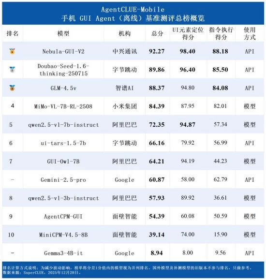 - 手机GUI Agent测评结果发布,中兴通讯星云AI登顶三大榜单