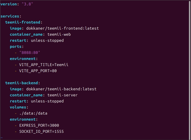 拉取完成后,为Teemii创建一个独立的数据目录并在该目录下编写docker -compose.yml,将前端服务映射到8088端口,将后端服务的/data映射到本地文件夹,方便日后管理与备份。