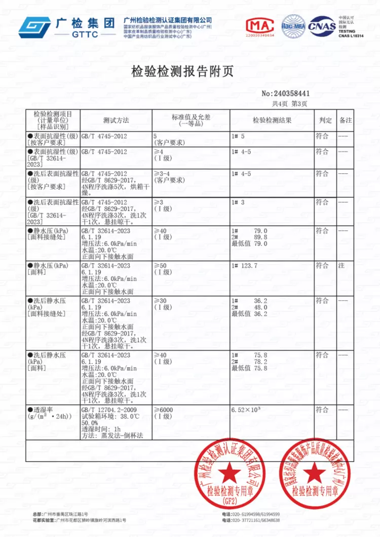 作为冲锋衣的核心指标,AD3306的防水性能经过了专业检测与实际场景双重验证。根据GTTC广检集团的检测报告,该产品面料静水压达到123.7kPa,远超GB/T 32614-2023标准中Ⅰ级要求的≥50kPa。而SGS检测报告更显示,其防水性能达到17000mmH2O级别,即便经历5次水洗后,防水性能几乎没有衰减。