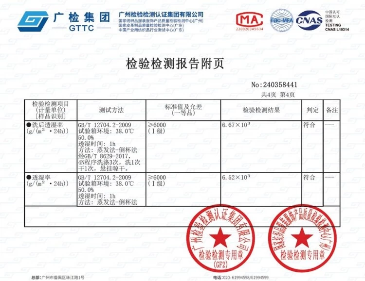 户外出行中,衣物的透湿性能直接影响穿着舒适度。秋冬钓鱼,基本上身体不会出汗,不会有湿气,对透湿性能需求很低,阿玛迪斯AD3306在保证强防水的同时,并未牺牲透湿性,其透湿率经检测达到6.52×10³g/(m²·24h),洗后透湿率仍有6.67×10³g/(m²·24h),均远超GB/T 32614-2023标准中Ⅰ级≥6000g/(m²·24h)的要求。