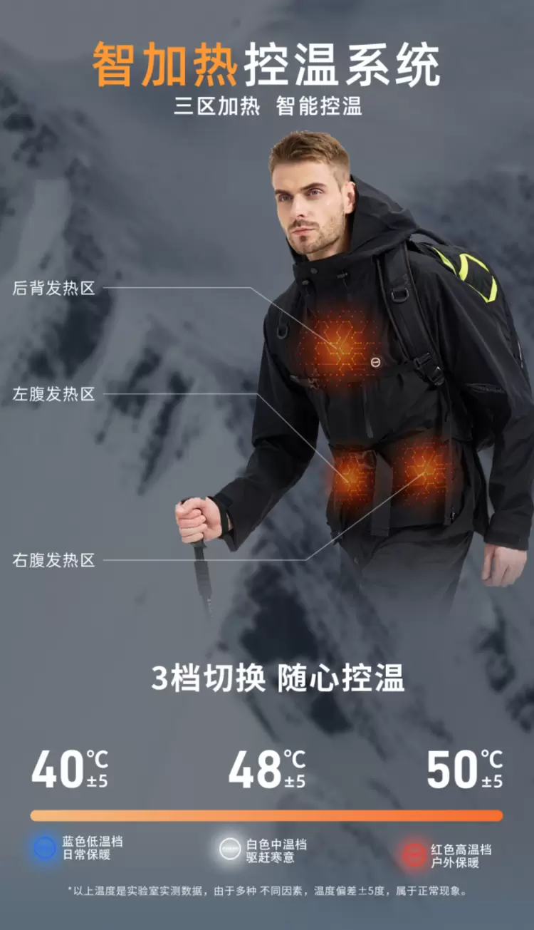 实测过程中,开启加热功能后,仅需1秒即可感受到暖意,3秒内温度达到设定档位标准。在-5℃的户外环境中,开启高温档使用4小时后,衣物仍能保持稳定发热;常温档续航可达6小时,低温档则能持续保暖8小时(基于10000mAh充电宝测试),完全满足单日户外出行的保暖需求。值得称赞的是,加热模块经过防水处理,即便衣物沾水或轻微淋雨,也不会影响加热功能的正常使用,安全性十足。