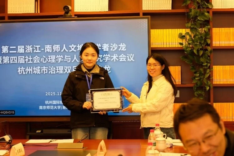 当日所有汇报环节落下帷幕后,会议随即开展演讲证书颁发仪式。由南京师范大学胡晓辉教授、浙江省城市治理研究中心接栋正研究员等主办方代表,为参与本次下午汇报的11位研究生逐一颁发演讲证书。胡晓辉教授在颁奖环节提到,青年研究者的探索是学科发展的鲜活动力,这份证书既是对大家研究成果的肯定,也期待能成为后续学术深耕的一份激励。现场响起热烈掌声,不少汇报学生手持证书与点评老师交流,氛围温馨而热烈。