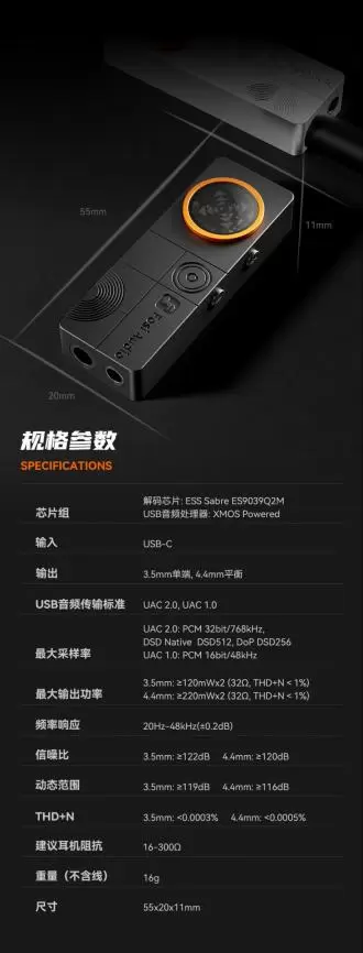 2.实用设计细节:机身仅55mm×22mm×11mm,重量16g,支持3.5mm单端与4.4mm平衡双接口,单端输出功率可达120mW,平衡输出220mW,轻松驱动各类耳机;