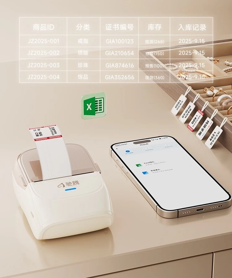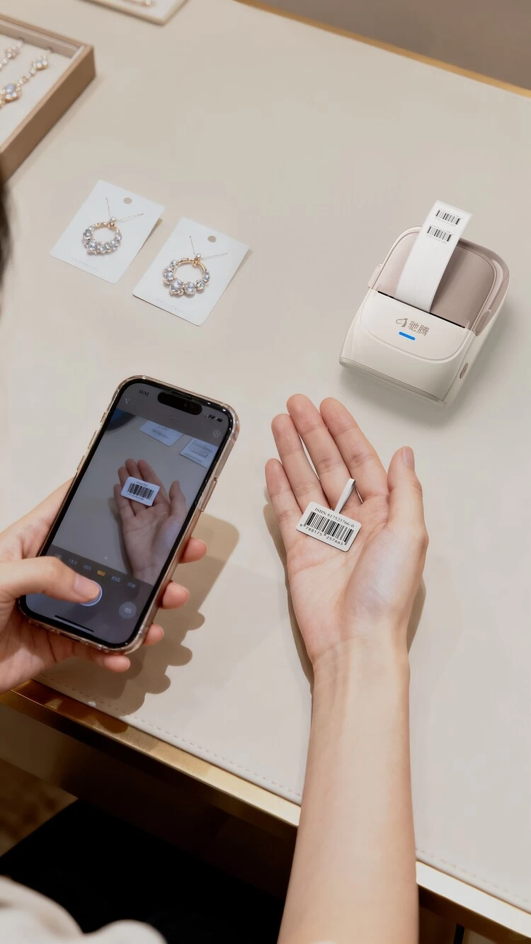 驰腾珠宝标签解决方案建立在坚实可靠的硬件基础之上。设备支持行业高标准的203DPI高清打印,确保从纤细的字体到精密的条码都清晰可辨;小巧便携的机身结合稳定的蓝牙连接能力,赋予了其在柜台、仓库、展台间灵活移动的作业自由。这些特性共同构成了应对珠宝行业多变环境的“基础能力”,为后续的智能化应用提供了稳定输出的保障。