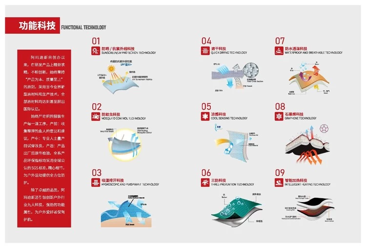 经过26年的技术积累与市场深耕,阿玛迪斯建立了九大功能科技体系,涵盖防晒抗紫外线、防水透湿、智能加热等核心技术,并与YKK、百和、高士线业、科德宝等国际顶尖供应商建立战略合作,确保产品品质达到行业领先水平。目前,阿玛迪斯已在全国建立了800多个销售网点,线上电商平台钓鱼服品类销量连续多年位居前列,并多次成为国家级钓鱼赛事指定服装供应商。