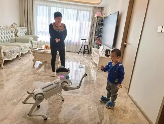 钟女士家的老人孩子与“灵犀”四足机器人互动