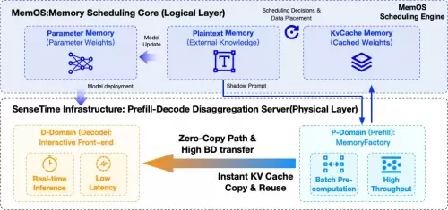 P域(Prefill Domain)变成真正的“记忆工厂”,集中承载影子上下文的预测与KV Cache的批量预生成,这些任务通常对吞吐敏感、对时延容忍度高,因此可以在P域以高并行、高利用率的方式被源源不断地消化掉,而不再与前台交互抢占资源;D域(Decode Domain)则被打造为纯粹的“实时交互前台”,专注处理真实用户请求的解码过程,在保持超低TTFT的前提下,承担起R1这一类大模型在C端场景的连续输出与稳定响应;跨节点KV Cache则通过高带宽互联与零拷路径实现“即产即用”,MemOS的激活记忆机制与商汤在某国产GPGPU上打磨出的通信能力形成天然互补,使Prefill产生的KV Cache不再成为传输瓶颈,而是以极低开销进入D域的解码流程中。