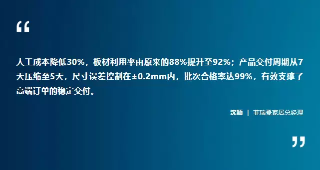 显然,“提质、增效、降本”是定制家具企业一直所努力的目标。菲瑞登也正积极推进工业4.0工厂规划,计划引入更多豪迈智能设备,重点布局开料、封边、钻孔及包装系统,提升整厂协同效率,实现“省人工+高效率”的智能制造新模式。