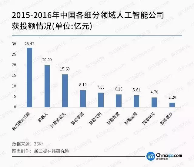 从获投金额来看,国内获投最多的人工智能领域为自然语言处理、机器人、计算机视觉。从36Kr数据显示,中国2015-2016年人工智能领域获投最多的领域有自然语言处理、机器人、计算机视觉,均超过15亿元人民币。