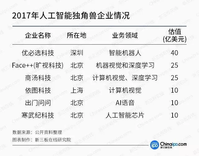 根据科技部火炬中心发布的《2017年中国独角兽企业发展报告》,2017年中国164家独角兽企业中,人工智能独角兽企业数量有6家,在整个独角兽企业中的占比3.66%,独角兽企业数量排名第10位;6家企业总估值120亿美元,在整个独角兽企业估值中占比1.91%,位居全行业第11位。