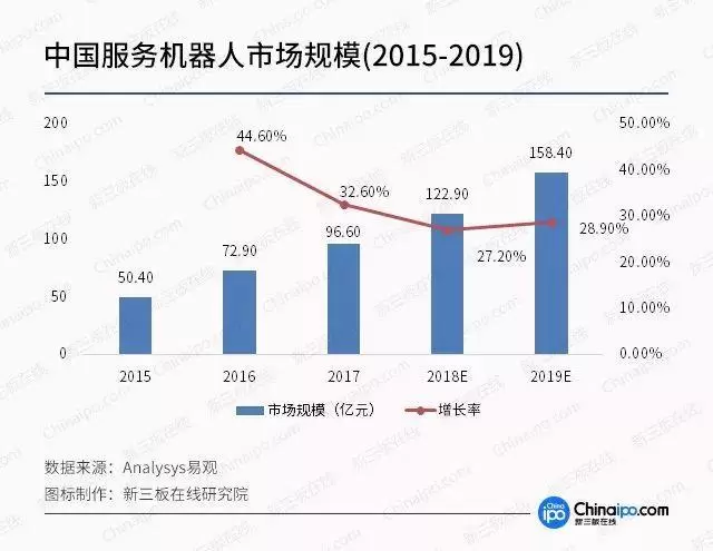 根据易观发布的《中国服务机器人市场趋势预测2017-2019》显示,2018年中国服务机器人市场规模将达到122.9亿元人民币,同比增长27.2%。根据统计数据,虽然服务机器人市场规模持续扩大,但2017年的市场规模增速较2016年下降了12个百分点,按照易观的预测,2018年的增速将会继续下降。