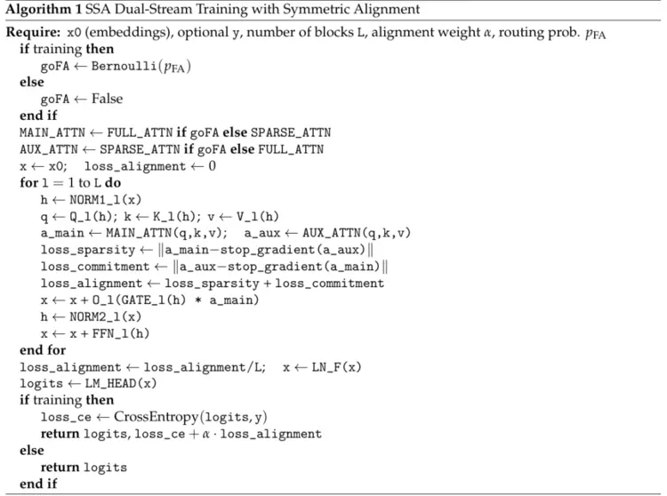 层级别的双向对齐损失,用以约束稀疏注意力与全注意力输出的一致性(详见算法1)。