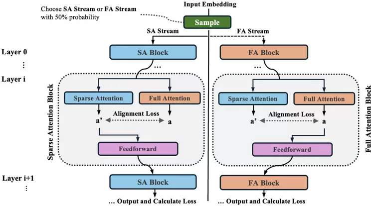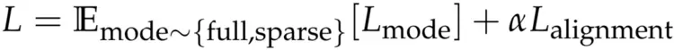 其中,Lmode表示在随机采样的注意力模式(全注意力或稀疏注意力)下计算的交叉熵损失,α 为权重系数,Lalignment为双向对齐损失,旨在促进全注意力与稀疏注意力输出的一致性。