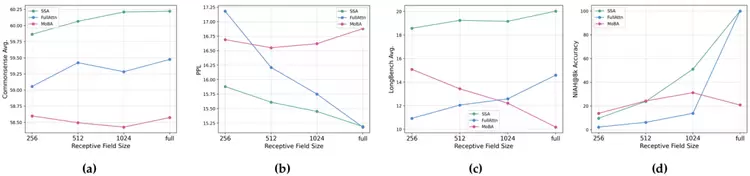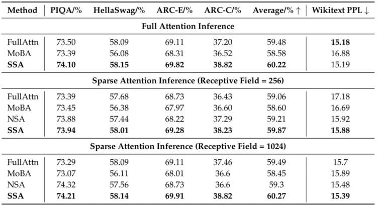 如表1所示,在PIQA 、Hellaswag 、ARC‑Easy以及ARC‑Challenge这些常识推理任务中,SSA 不仅优于所有稀疏基线,甚至以仅 256 Token的感受视野(receptive field)超越了全注意力模型。两者在全注意力下的语言建模能力(PPL)相当,但 SSA 的下游任务性能显著更高。