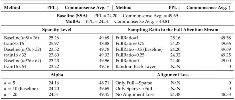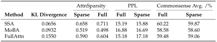 表6 SSA、MoBA 和 FullAttn 在 KL 散度、注意力稀疏性、困惑度及基准任务准确率方面的对比
