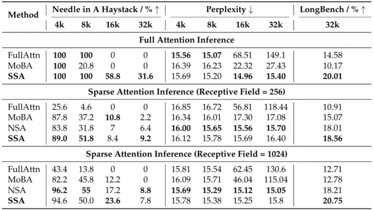 如表2所示,在大海捞针任务(Needle-in-a-Haystack)中,SSA 在几乎所有感受视野下(除 1024 外)均为最强的稀疏注意力方法,并在全注意力推理下达到 100% 准确率。