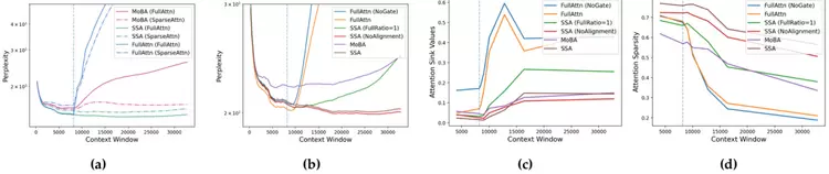 图4 (a) 不同上下文长度下的困惑度。(b) 在 SSA 中提高稀疏注意力训练的比例,可提升模型在长上下文上的外推能力。(c)相较于 MoBA 和 FullAttn,SSA 在局部位置分配了更高的 logits 权重。(d) FullAttn 将大量注意力质量分配给了 8K 以外的 token。其中,图 (a) 使用 1B 参数模型,图 (b–d) 使用 300M 参数模型