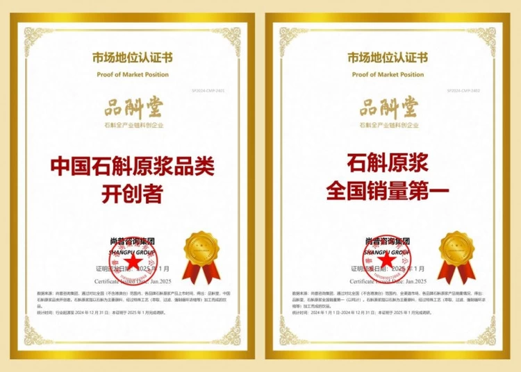 近期,品斛堂凭借其在石斛全产业链的卓越表现,被国际权威咨询机构灼识咨询(CIC)认证为“中国紫皮石斛全产业链第一品牌”“全国最大的紫皮石斛全产业链服务商”、“中国石斛原浆消费者满意度第一”。