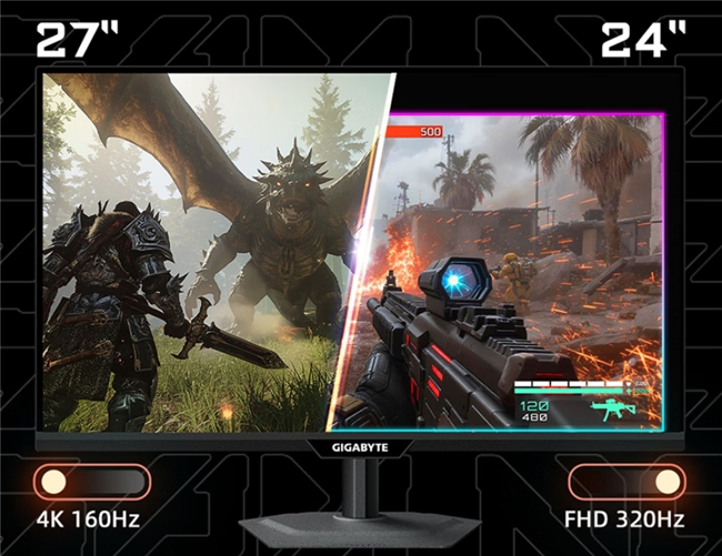 相较于传统显示器,技嘉M27UP-QZ的最大特点是可以在1080P@320Hz与4K@160Hz之间自由切换,并且支持16:9、4:3、5:4等不同画面比例,在1080P下可像素点对点缩放画面,模拟24寸显示器的实际观感,满足FPS玩家画面“一览无余”无死角的控场需求,提升瞬时反应力。多模式的切换只需要按压显示器中间的“战术键”即可立刻切换,让用户更能灵活应对不同场景需求。