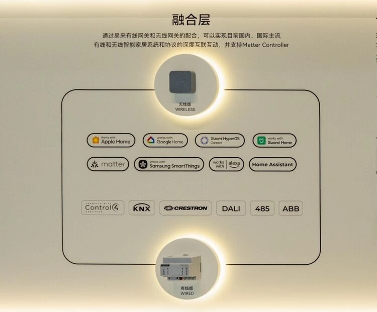 针对行业长期存在的“生态割裂”问题,易来构建了“有线+无线”双网关协同体系,实现国内外主流智能家居系统与协议的深度互联互通。其中,无线协议全面覆盖HomeKit、米家、Google、Matter等全球主流标准,有线协议则兼容Control4、KNX、DAIL等协议,从根源上打破不同品牌、不同技术路线设备间的壁垒,让用户可以自由选择有线或者无线方案,也不必局限于某一品牌的产品。