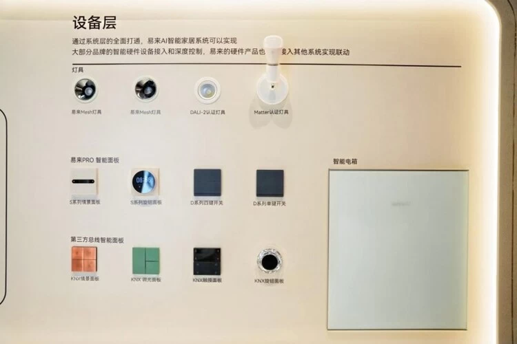 依托系统层的全面贯通,易来构建起开放包容的硬件接入生态。这一体系既支持易来自有智能灯具、智能面板等全系列产品的深度管控,也能实现多数第三方品牌智能硬件的无缝接入与协同联动,同时易来硬件产品可灵活融入其他主流智能系统,构建起 “双向兼容” 的开放生态格局。