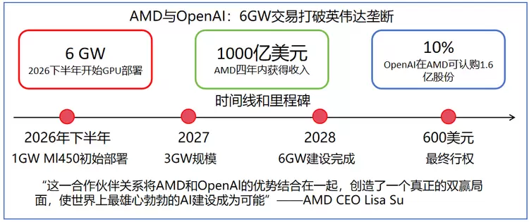 与英伟达的合作几乎同时,OpenAI于2025年10月宣布与AMD签署为期四年的协议,将分阶段部署总计6GW的AMD GPU算力,首批1GW将于2026年下半年到位,使用AMD下一代Instinct MI450系列GPU集成机架级AI系统。