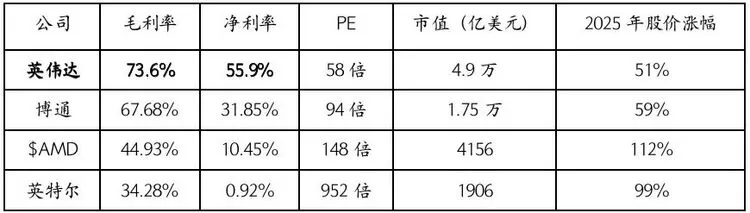 (注:英伟达是2026财年三季度数据,AMD是2025财年上半年数据,博通与英特尔是2025财年前三季度数据,来源:富途)