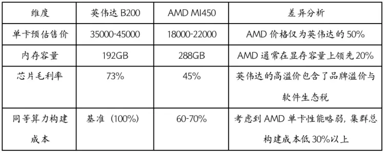 根据2025年英伟达与AMD公布的财报,构建简易模型对比英伟达(以B200对应世代产品为例)与AMD(以MI450为例)的单卡成本结构。