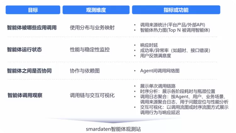AI模型本身(如用于销售预测的模型)也需要被管理、部署和监控。如何确保生成的智能应用能持续稳定地提供智能服务?这要求AI智能体自身就是一个优秀的“AI工程师”。 在smardaten生成包含智能模块的应用时,模型开发平台能自动完成模型的版本管理、服务封装(如提供标准的API)、以及生成基本的监控和日志代码。所有智能体在运行过程中均由Agent观测站全程监控,具备状态追踪、行为分析与运行回溯能力,这使得生成的系统不仅能部署模型,还能追踪其性能,在出现数据漂移或准确率下降时发出预警,为后续的模型迭代提供依据。这种能力确保了系统中的“智能”是可持续、可运维的。