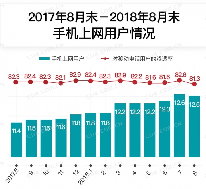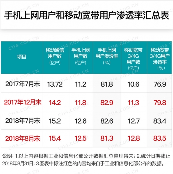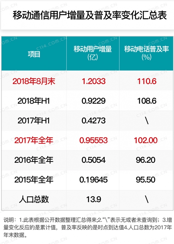 在不限量套餐服务刺激下,移动电话用户继续保持较快增长。截至7月底,三家基础电信企业的移动电话用户总数达15.2亿户,净增1.07亿户;移动宽带用户(即3G和4G用户)总数达12.7亿户,占移动电话用户的83.4%;手机上网的用户数达12.6亿户,对移动电话用户的渗透率为82.6%。今年1-8月份的数据显示,三家基础电信企业的移动电话用户总数达15.4亿户,同比增长11.3%,净增1.2亿户;移动宽带用户(即3G和4G用户)总数达12.8亿户,占移动电话用户的83.5%;手机上网的用户数达12.5亿户,对移动电话用户的渗透率为81.3%。如果把时间节点继续向前推进,数量的变化就会更加明显。由于移动通信用户数的爆炸式增长,我国移动电话普及率从2017年年末的102部/百人,快速增长到今年8月末的110.6部/百人。然而,该指标从2015年年末到2017年年末的数值仅仅从95.5部/百人增长到102部/百人。