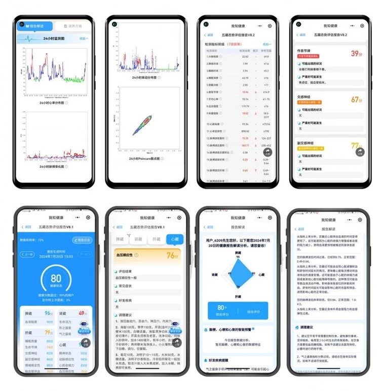 二是中医健康手表。以智能可穿戴手表为数据采集和监测载体,对人体生物信号进行自然状态下长时程、高频次的实时监测。通过小程序提供终端数据报告展示和健康管理指导和干预预警服务。核心功能有三部分。(一)持续健康监测和主动式预警:利用高精度光电容积传感器,每秒100次采集血液流速、脉搏波、体动、心率变异等数据,模型自动对应形成心率、血氧、睡眠、压力、步数等生理指标并进行分析,对心梗、脑卒中等疾病进行健康监测和风险预警,预警方式包括消息通知、短信和电话等。(二)中医测评健康报告服务:模型通过对生理指标分析,会以日、周、月形式提供中医测评健康报告,并同步给亲属家人。报告包括中医五藏、中医体质辨识、慢病趋势、心理压力等。当用户及其家属对报告不理解和有疑问时,平台提供健康管理师进行报告解读服务和日常生活健康指导服务。(三)全流程闭环健康管理服务:支持给用户提供生理、心理、营养等全方位的健康评估,根据评估结果和个性需求,推荐运动、膳食、音乐和日常保健方案,通过平台健康管理师还可为慢病人群制定个性化的健康指导方案和日常提醒方案(包括健康宣教、服药提醒、复诊提醒、体检提醒等)。手表已经服务了近5万用户,生成500余万份健康报告。