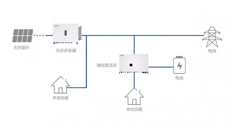 在交流耦合方案中,光伏发电系统与储能系统在交流侧并联。光伏组件产生的直流电(DC),首先通过一个独立的光伏逆变器转换为交流电(AC),这个交流电优先供给本地负载使用,余电也可以馈入电网。