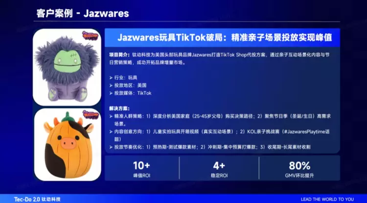 钛动科技作为全球领先的、以商业智能和技术驱动的一站式出海营销服务商,始终致力于以创新的全域增长解决方案,赋能品牌在全球市场实现商业成功。钛动科技与全球头部玩具品牌Jazwares在美国市场的成功合作,正是其深度理解行业、精准运用平台、以科技赋能创意的最佳实践,成功开辟了玩具品牌通过TikTok Shop实现品效峰值的新路径。