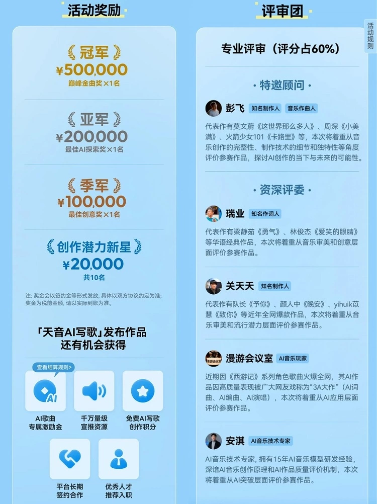 据介绍,本次AI音乐创作大赛强调专业性与创意性,评审期专业评审和大众评审占比分别为60%和40%。专业评审团由特邀顾问彭飞,资深评委瑞业、关天天、漫游会议室、安淇等知名音乐人和AI音乐专家组成,大众评审则由网易云音乐“音乐合伙人”组成,专家与大众评审将从“音乐审美、技术突破、主题创意、流行潜力”四个维度对参赛作品进行打分,评出Top5歌曲。在冠军公开投票期,Top5歌曲将接受公众终极投票,投票得分按比例统一换算后与评审阶段总分相加,最终得分最高者将斩获大赛冠军,获得50万元奖金。