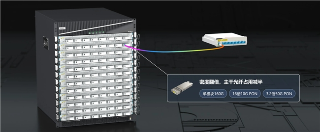1、单端口高密度彩光 : 该方案在 CWDM( 粗波分复用 ) 技术路线上的持续突破,核心实现了 1:16 的超高收敛比。一个核心交换机端口通过一个特殊设计的 1:16 高密度彩光模块 ,可以同时发出和接收 16 种不同波长的光信号。这意味着,一个物理端口可以虚拟出 16 个独立的逻辑端口,每个逻辑端口独享 10Gbps 带宽,从而实现了单机支持 1536 x10G 节点,单端口带宽达到 160G, 是 50GPON 的 3.2 倍。同时,16 波长聚合能力达到业界的 2 倍,使主干光纤使用量减半,减少挖沟埋缆等施工操作,助力客户构建超大二层架构,降低施工成本和施工难度。