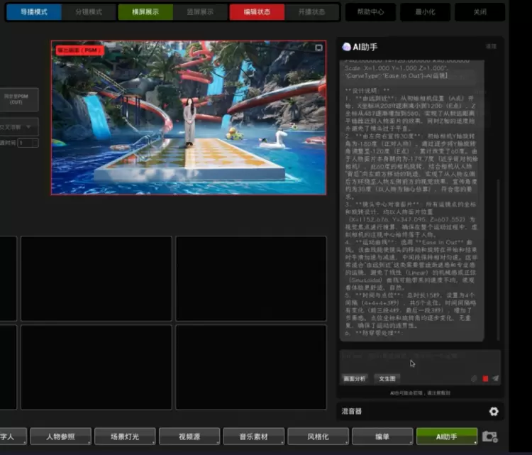只需在系统界面中点击AI助手并输入"帮我设计一个运镜",系统即刻基于当前XR机位的物理参数与场景空间关系,通过智能解构引擎自动生成符合常规演播规律的机位运动轨迹,包含机位轨迹、焦距变化、节奏控制等多项参数,并输出包含各项运镜数据与设计思路的运镜方案。