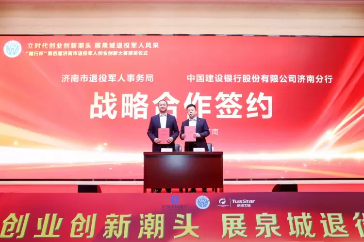 活动期间,济南市退役军人事务局与中国建设银行股份有限公司济南分行签署退役军人创业金融服务项目战略合作协议。双方将在金融支持、资源对接、服务保障等方面深化合作,共同构建退役军人创业创新长效支持机制。