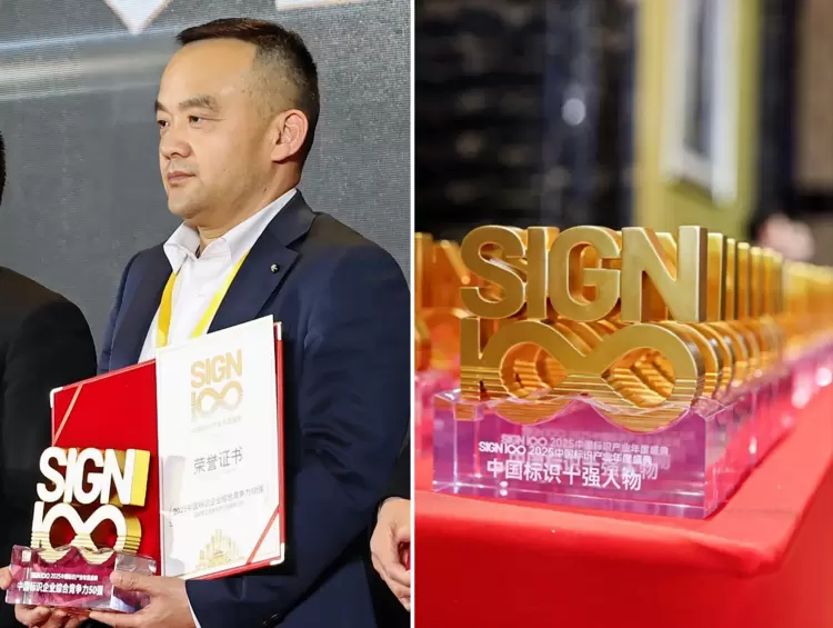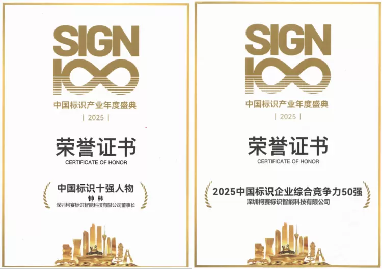 作为全国十大标识标牌厂家之一,深圳柯赛标识智能科技有限公司在此次行业巅峰盛会中脱颖而出,公司一举斩获“2025中国标识企业综合竞争力50强”,公司董事长钟林也凭借在行业数字化与智能化发展中的卓越贡献,荣膺“2025中国标识十强人物”称号,以双项大奖展现了其在行业内的领先地位与强劲实力。