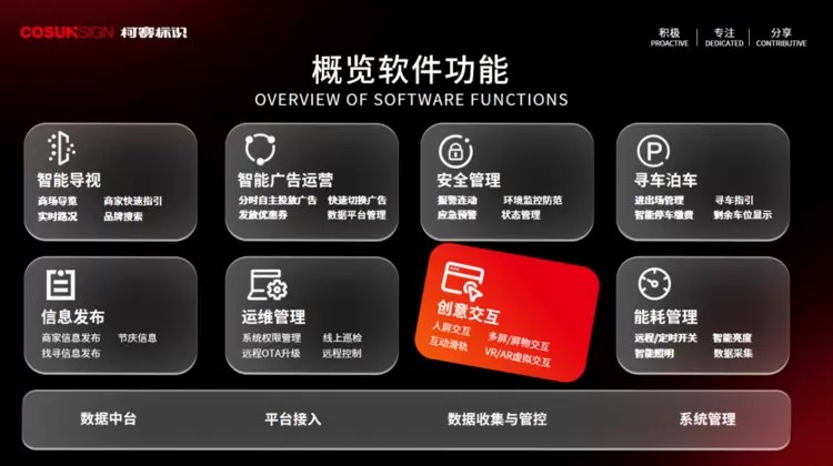 在此基础上,柯赛标识积极拥抱技术变革,以智慧解决方案引领服务升级。依托云计算、物联网、自动化控制等前沿技术,柯赛标识打造的智慧标识解决方案,实现了各系统间的信息交互、共享联动,既保证了单个系统的独立运行,又达成了数据互联互通,为数字标牌制作、展厅设计施工、城市更新项目等提供兼具科技感与实用性的一体化解决方案。目前,公司产品远销65个国家和地区,服务超过5000家国内外客户,完成10000多个工程案例,成为我国标识标牌制作厂家中标杆企业。