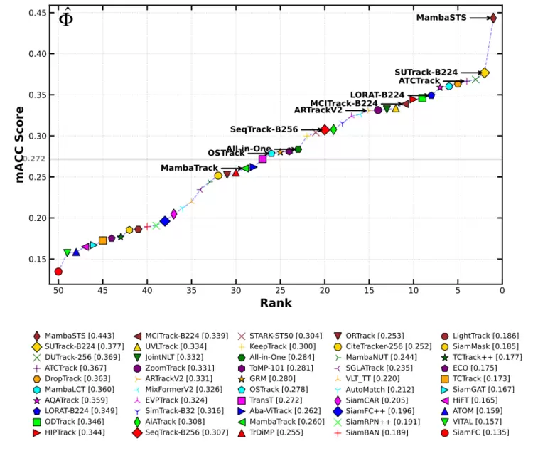 -MambaSTS的强项:在快速运动(FM)、运动模糊(MB)、小物体(SO)等属性上表现稳健,得益于其强大的时序建模能力。