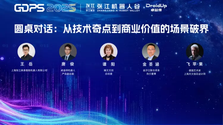 圆桌论坛环节,由上海张江具身智能机器人有限公司王岳主持,卓益得产品副总裁唐俊、精文文创总经理谭阳、金沙江创投执行董事金圣涵等嘉宾围绕产业趋势、技术方向、场景落地及资本赋能展开深度对话。