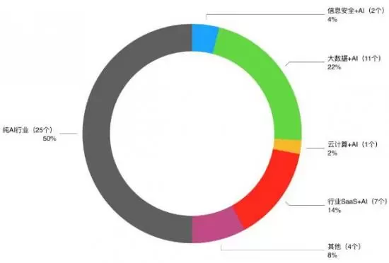 在细分行业统计中:纯AI行业产品有25个;信息安全+AI有2个;大数据+AI有11个;云计算+AI有1个;行业SaaS+AI有7个;其他行业+AI有4个。