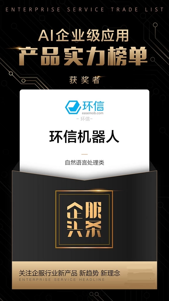 近日,由企服行业头条组织筹办的《AI企业级应用产品实力榜单》正式对外发榜,从众多候选的产品中,经过层层筛选及评审打分,“环信机器人”凭借强大的中文语义计算平台,深厚的AI技术沉淀以及在保险、航空、物流、教育等领域的大规模落地深耕领跑NLP客服领域。