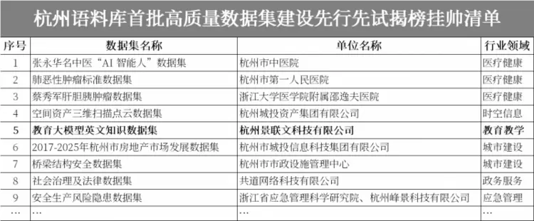 近日,在浙江省数据局指导下,杭州市数据资源管理局联合杭州市数据集团等单位,通过“揭榜挂帅”机制,正式发布首批50个杭州语料库高质量数据集建设先行先试清单。