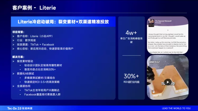 此策略驱动单日广告消耗峰值突破4万美元,整体ROI长期超越行业均值30%+。Literie案例证明,钛动科技的短剧化叙事提炼与数据引爆能力,能为拥有故事IP的客户,构建一套可复制的、高效的海外冷启动模型,为未来真正的短剧IP开发与发行铺平了前站。