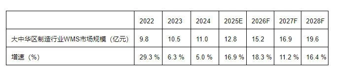 表1:2022~2028年大中华区制造行业WMS市场规模及增速
