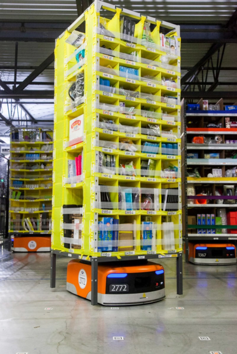 这项新技术正被应用于亚马逊的仓储过程中,工人将分销商和制造商送来的物品存放在仓库货架上的任何地方,只要它们的位置被记录在电脑中,机器人一下子就能再次找到它们。